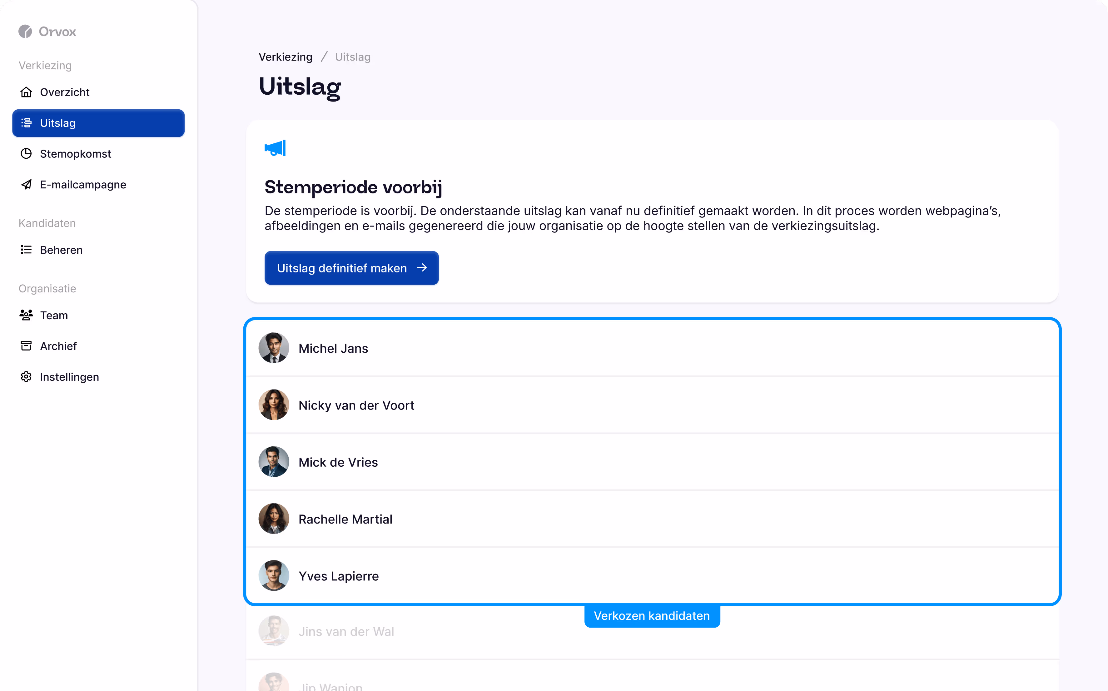 Organiseer moeiteloos OR-verkiezingen met ORvox: mooi, overzichtelijk en tot 99% geautomatiseerd. Jij zit aan de knoppen. Wij maken het makkelijk én professioneel.